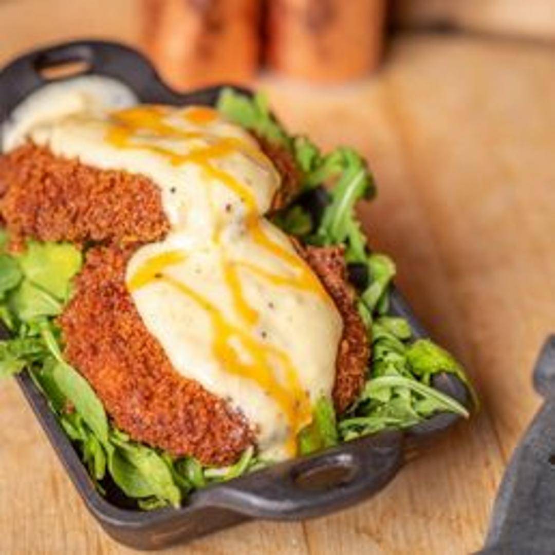 Pan-seared crab cakes made with lump crab meat, served with remoulade sauce and a side salad.