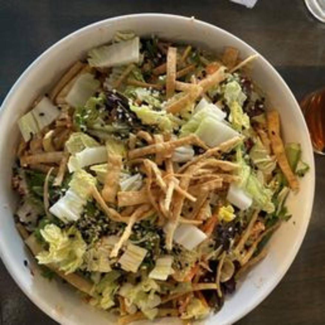 Grilled chicken, mixed greens, carrots, cucumbers, bean sprouts, and a peanut-ginger vinaigrette.