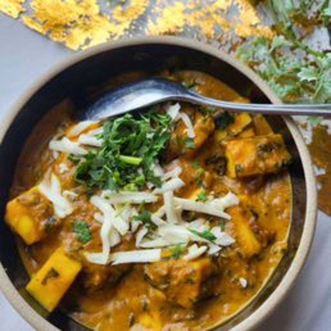 Cubes of Indian cheese (paneer) cooked in a smooth and creamy spinach-based sauce with mild spices.