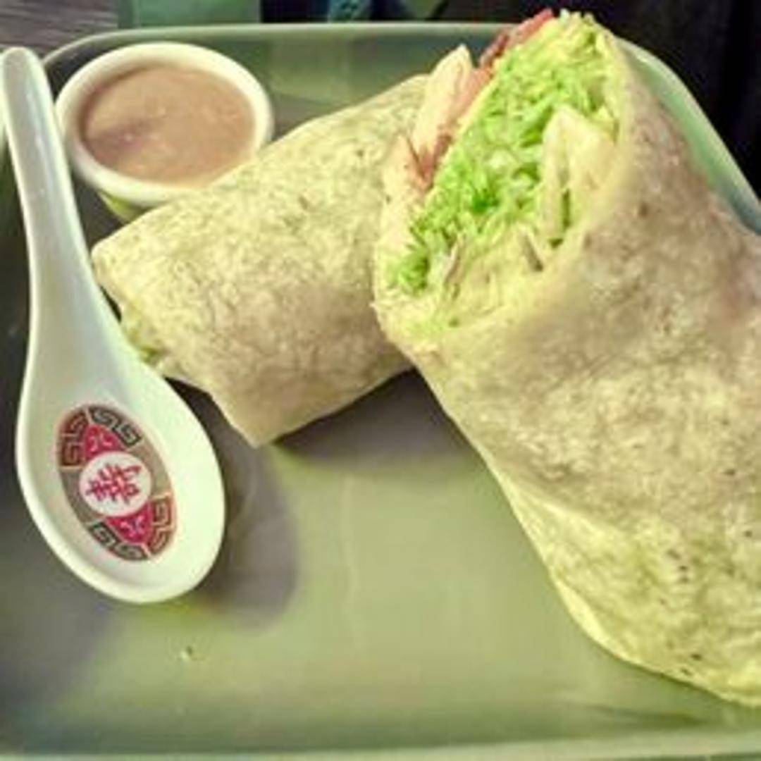 A flavorful wrap filled with a variety of fresh, crisp vegetables, often including lettuce, sprouts, carrots, cucumbers, bell peppers, and a delicious vegan dressing or hummus. A light and healthy lunch or snack option.