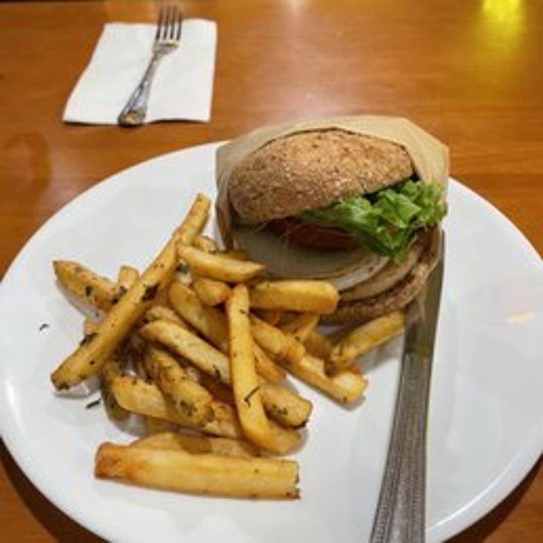 A plant-based chicken patty infused with savory garlic, served on a toasted bun with crisp lettuce, juicy tomato, sliced onion, and creamy vegan garlic aioli. A classic burger experience, entirely vegan.