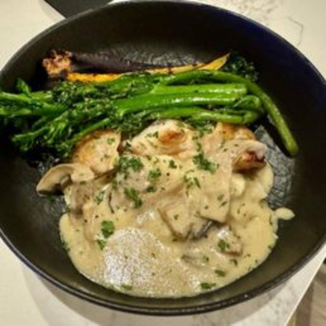 Roasted half chicken seasoned with herbs, served with seasonal vegetables and pan jus.
