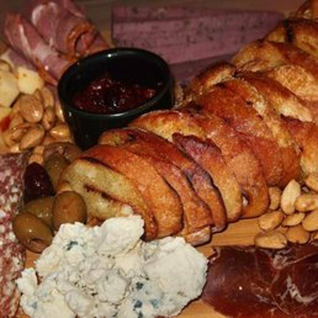 Creamy brie cheese served with fruit compote and toasted baguette slices.