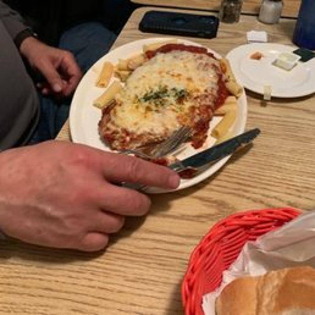 Lightly breaded veal cutlet topped with marinara sauce and melted mozzarella cheese. Served with a side of pasta.