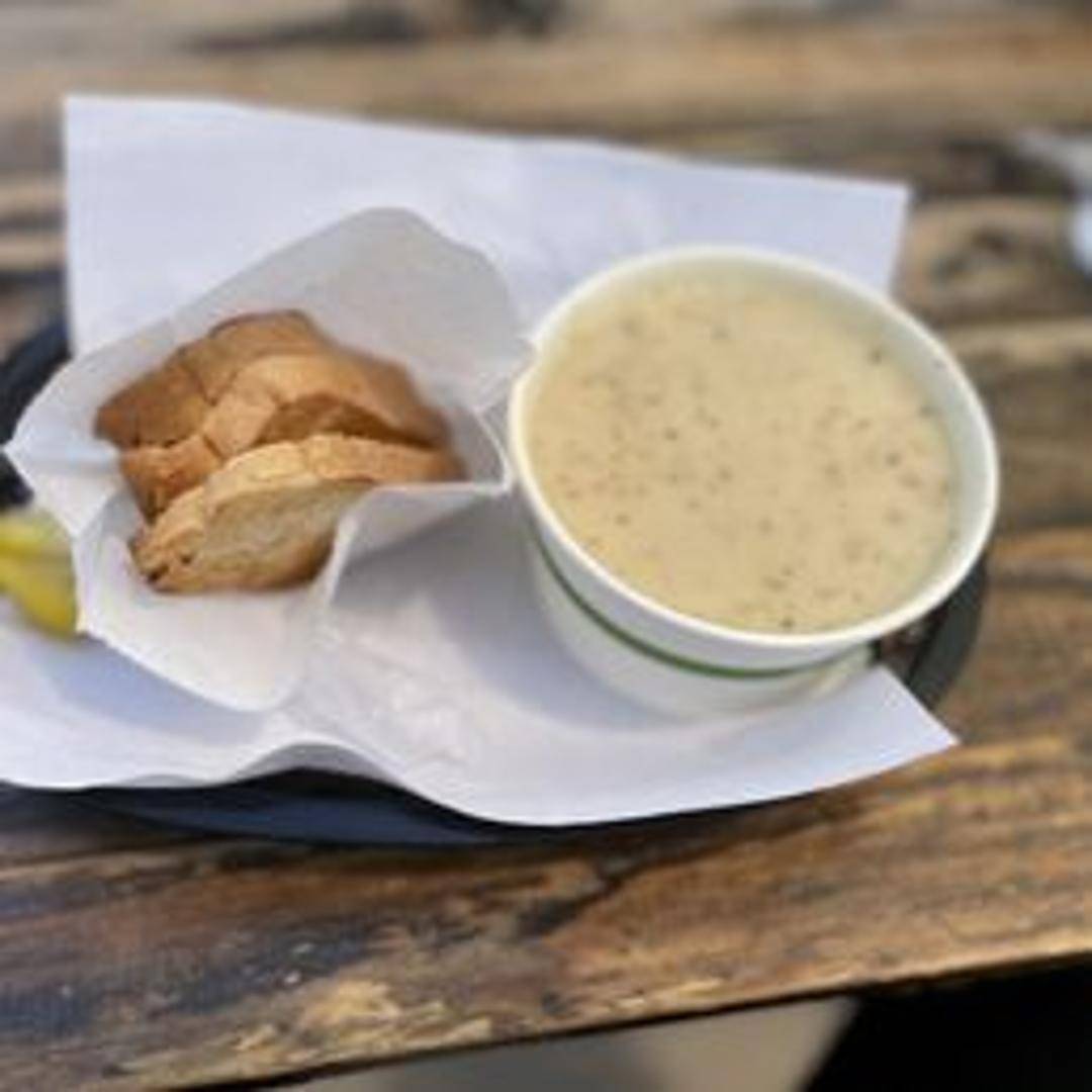 A creamy and comforting soup featuring tender clams, diced potatoes, celery, and onions in a rich, seasoned broth. Served hot and ready to enjoy.