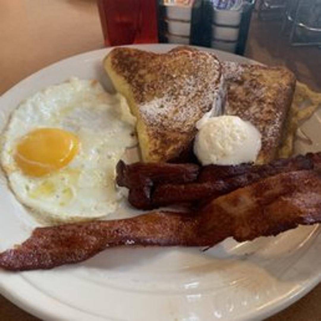 Two slices of thick-cut French toast grilled golden brown, layered with your choice of breakfast meat (bacon, sausage, or ham), scrambled eggs, and melted cheddar cheese. Served with a side of maple syrup.