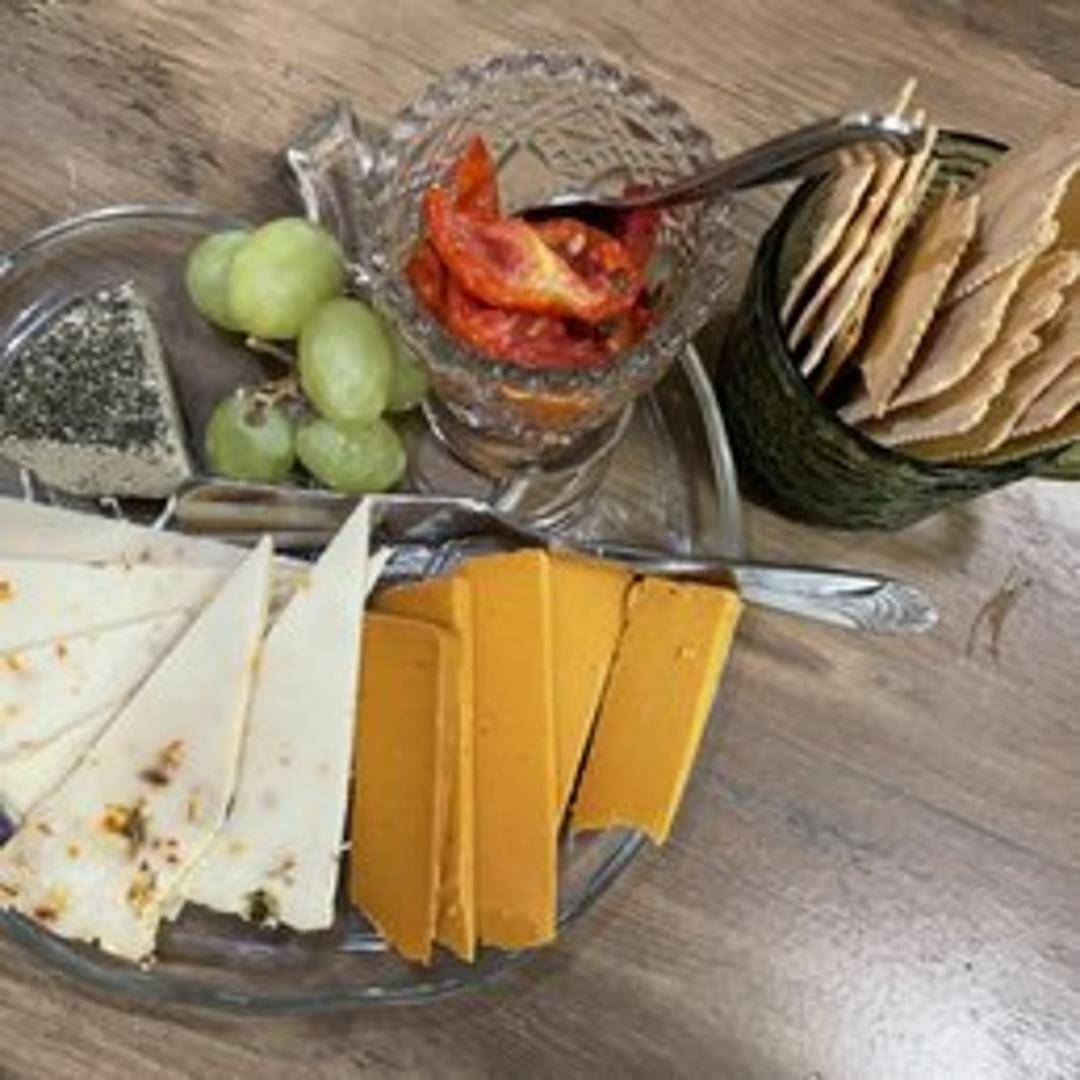 Sharp smoked cheddar cheese, sliced and served with crackers and fruit.