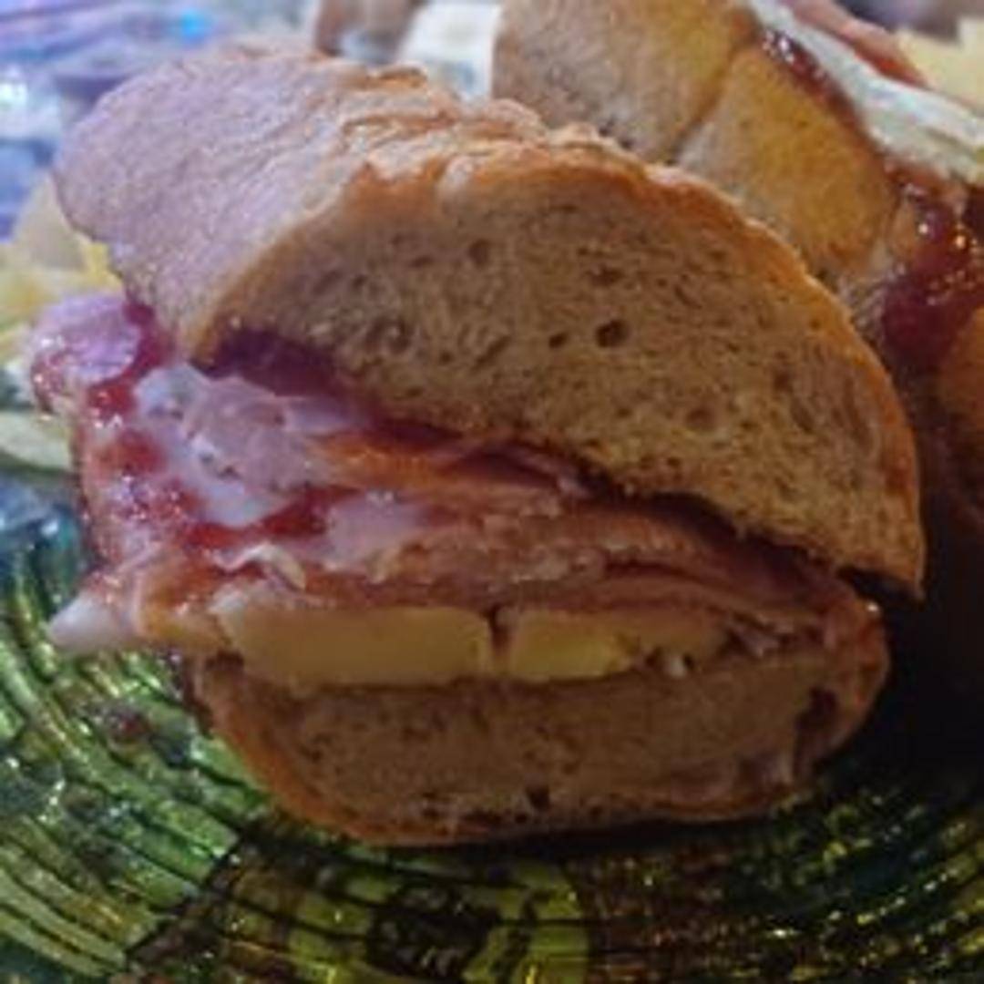 A baguette sandwich filled with ham, brie cheese, and Dijon mustard. Served toasted.