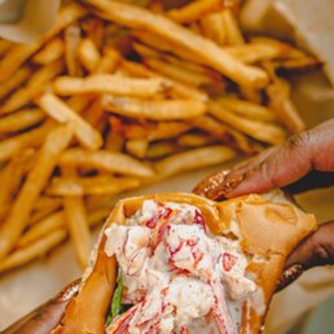 Indulge in the iconic Lobster Roll, featuring generous chunks of sweet, tender lobster meat. Prepared in a classic New England style, the lobster is lightly tossed with a touch of mayonnaise and perhaps a hint of lemon, then generously piled into a buttery, toasted split-top bun. A rich and luxurious seafood delight, perfect for a taste of coastal tradition.