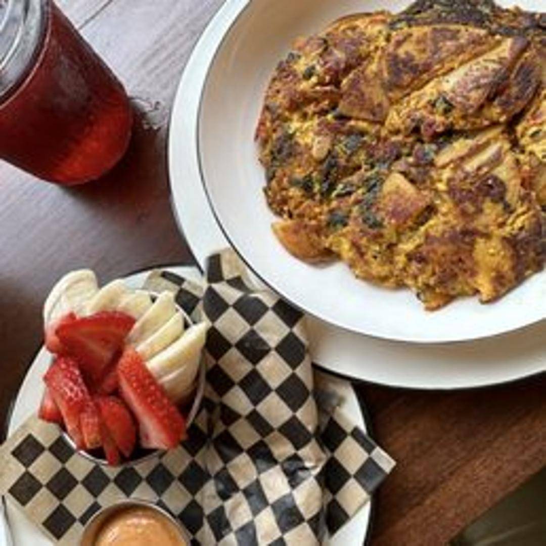 A large flour tortilla filled with scrambled eggs, cheese, potatoes, and your choice of protein. A hearty and portable breakfast option.