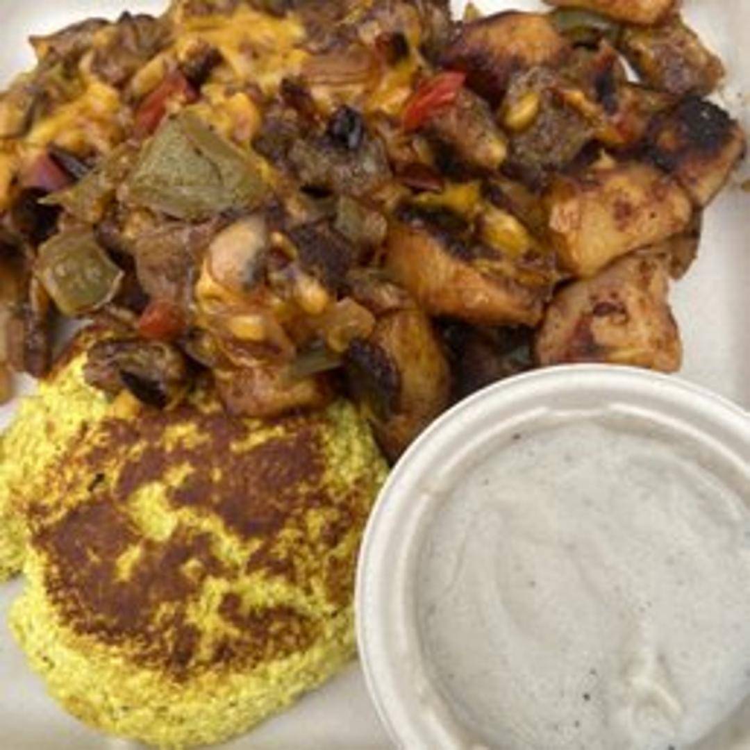 A hearty and satisfying plant-based breakfast plate. Includes your choice of plant-based protein, potatoes, and vegan toast. A complete and delicious vegan start to your day.