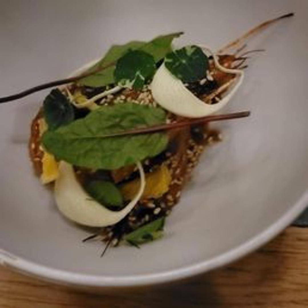 Fresh prawns, prepared using a specific cooking method and served with accompanying flavors and sauces, possibly grilled, sautéed, or fried.