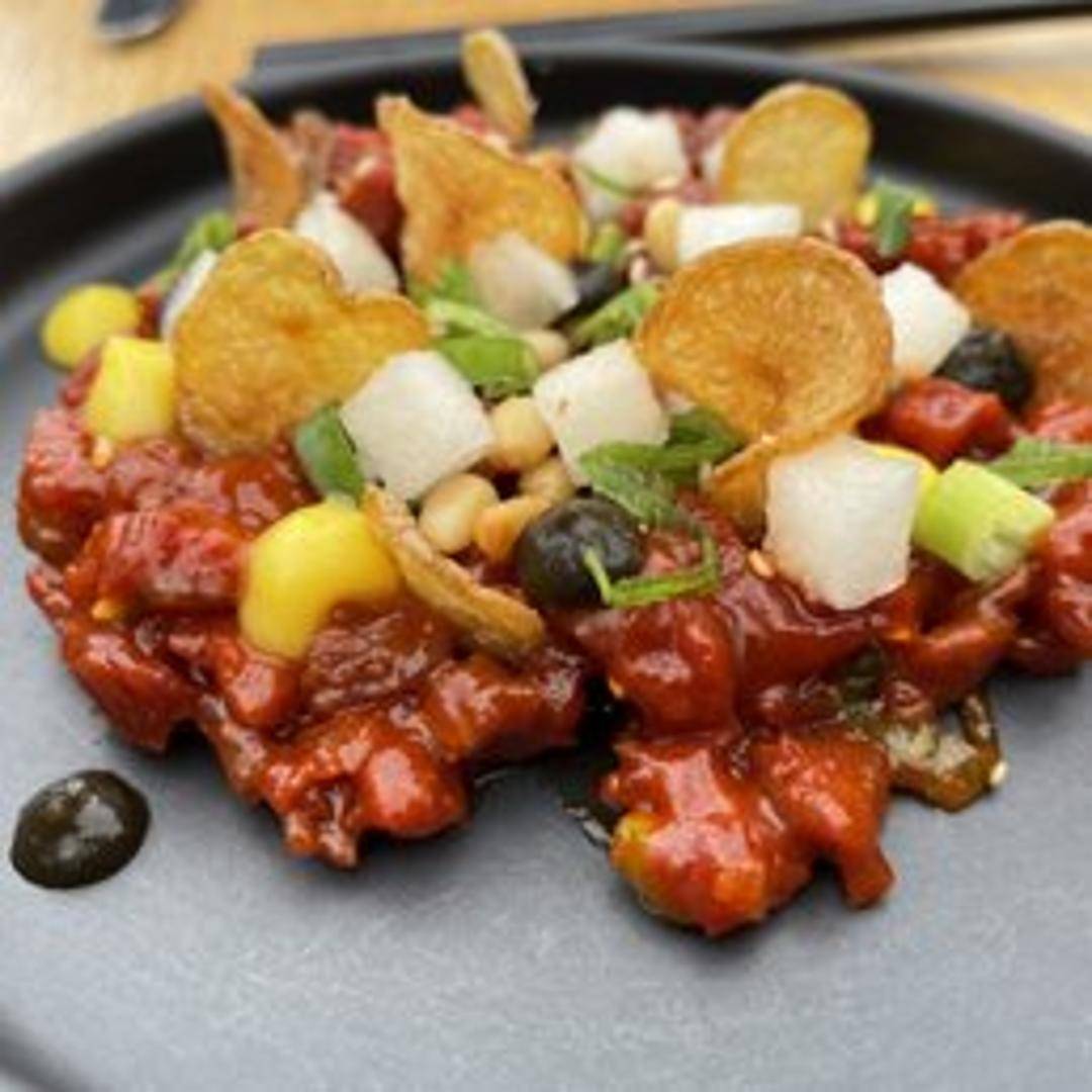 Finely chopped raw bison, seasoned with traditional tartare ingredients such as onions, capers, and herbs, served with toast points or crackers.
