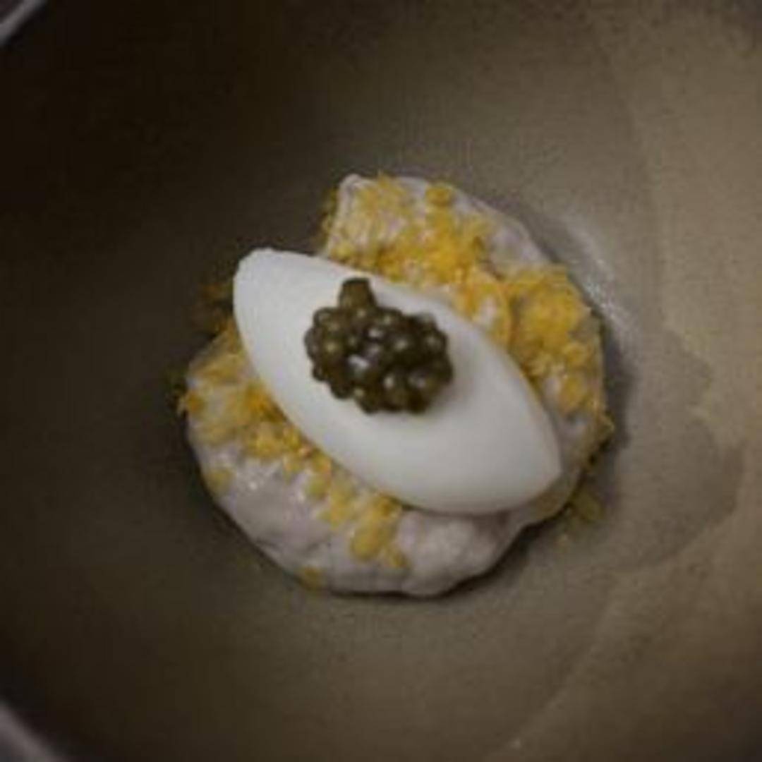 A small, palate-cleansing dish served between courses, likely featuring a light and refreshing combination of flavors and textures.
