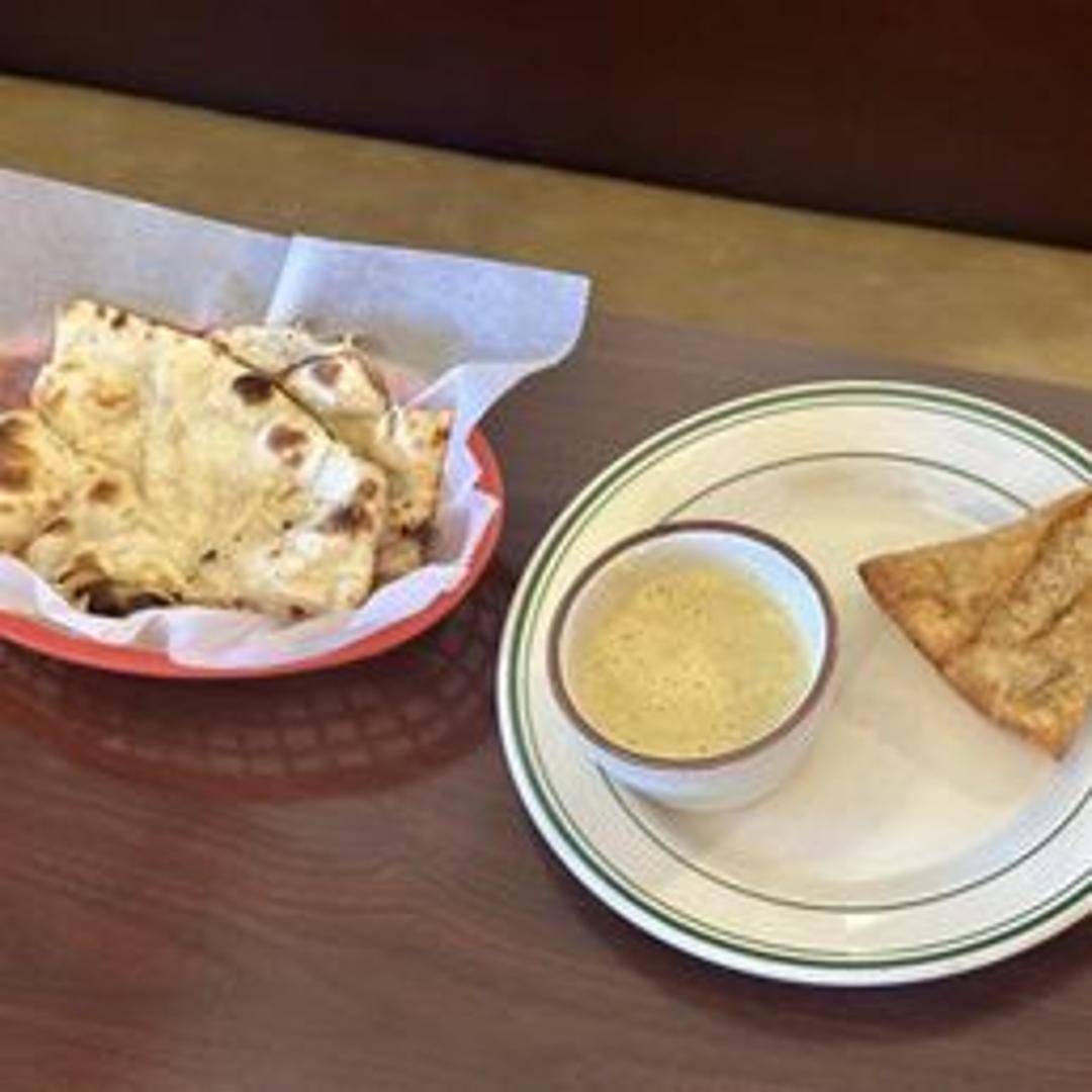 A fried or baked pastry with a savory filling, such as spiced potatoes, peas, lentils, and onions. Typically served with chutney.
