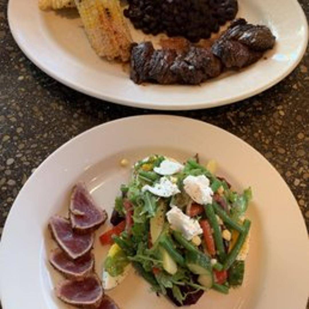 A vibrant and refreshing salad featuring perfectly seared, sushi-grade tuna, thinly sliced and served atop a crisp medley of mixed greens, fresh vegetables, and a light, zesty vinaigrette, offering a delightful balance of flavors and textures.