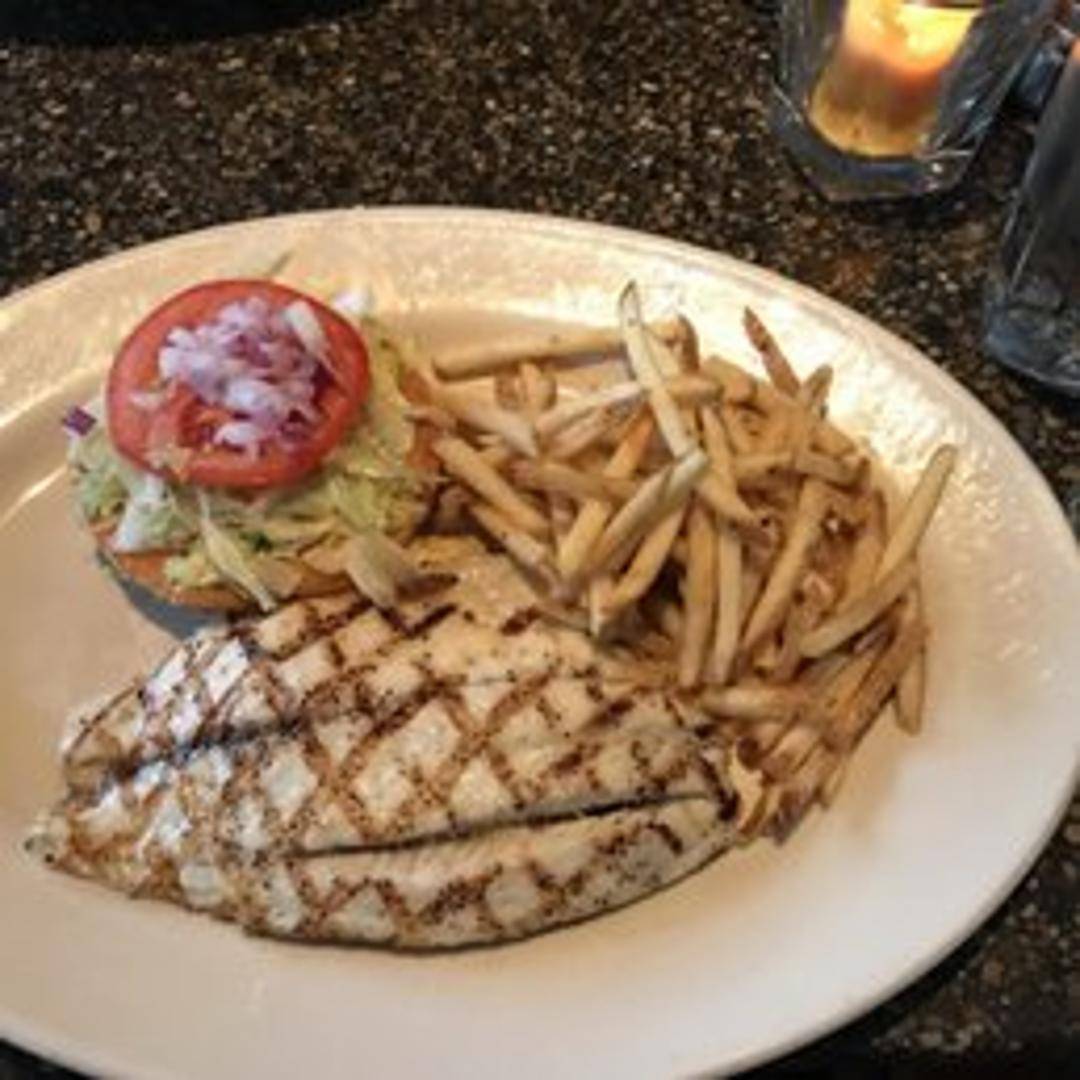 Our signature fish sandwich features a generous fillet of sustainable white fish, lightly crusted and fried to golden perfection. It's served on a toasted brioche bun with crisp butter lettuce, ripe tomato, and a tangy house-made remoulade sauce, creating a perfect balance of textures and flavors.