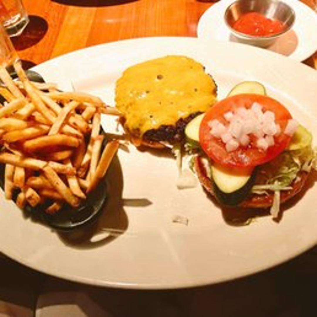 Our signature burger, crafted with a juicy, premium beef patty grilled to your liking. It's adorned with melted aged cheddar, crisp lettuce, ripe tomato, red onion, pickles, and our special house sauce, all served on a toasted brioche bun with a side of golden fries.