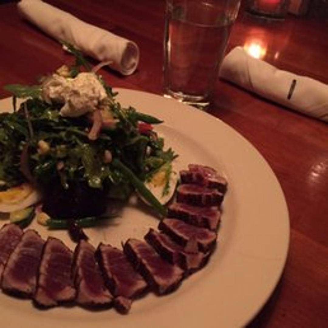 A prime cut of fresh Ahi tuna, expertly seared rare to lock in its delicate flavor and tender texture. This exquisite dish is typically accompanied by a vibrant vegetable medley and a light, complementary sauce to enhance its natural richness.