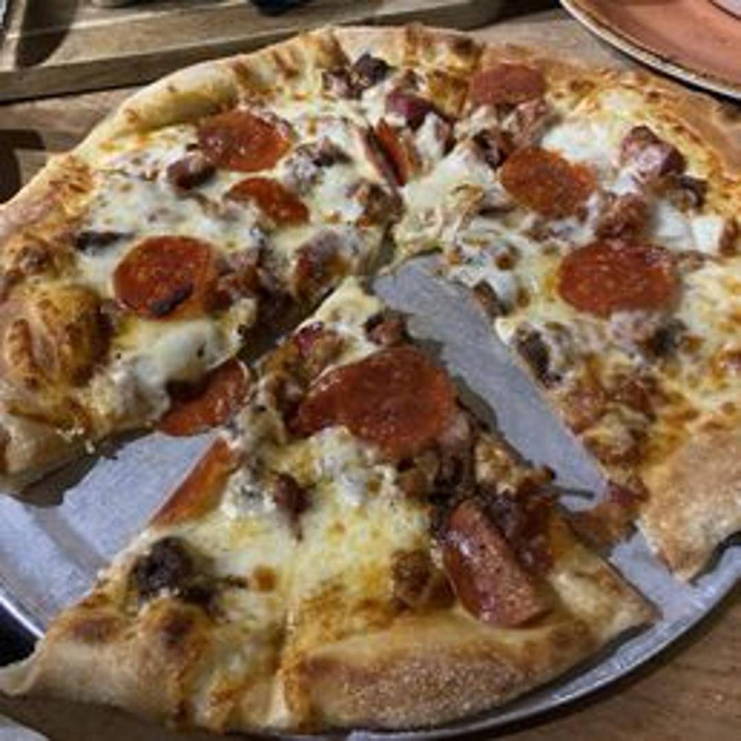 A hearty pizza piled high with a variety of savory meats, including pepperoni, sausage, bacon, and ham. Topped with our signature tomato sauce and mozzarella cheese.