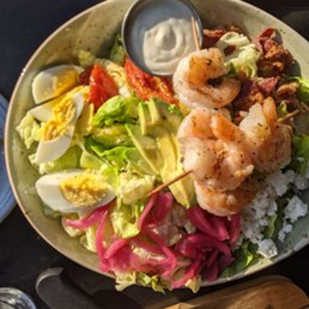A classic American salad featuring crisp lettuce, grilled chicken, bacon, hard-boiled eggs, avocado, tomatoes, and crumbled blue cheese. Served with your choice of dressing.