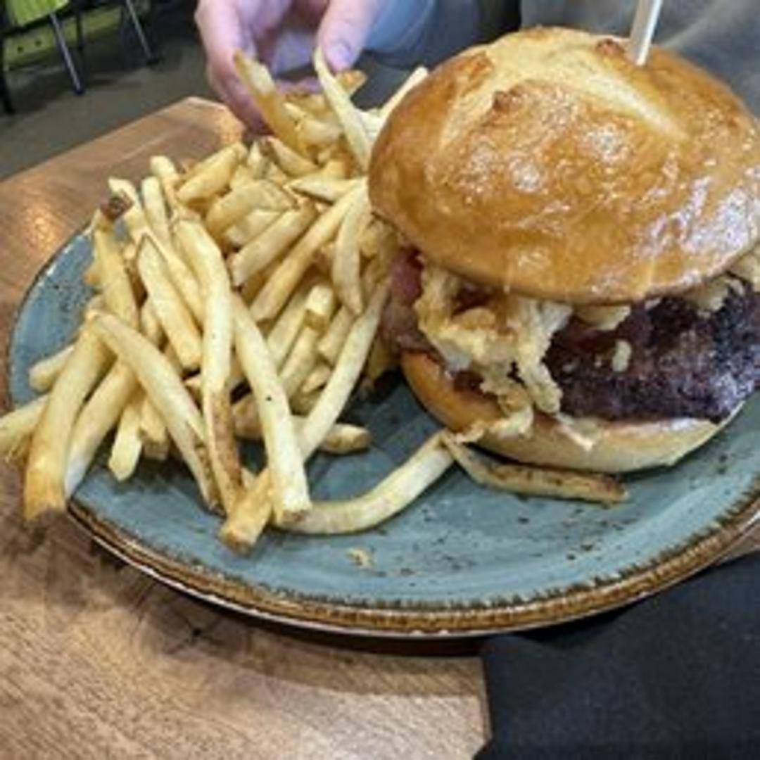A flavorful burger featuring a juicy patty topped with crispy bacon, our signature pimento cheese, lettuce, tomato, and onion. Served on a toasted bun.