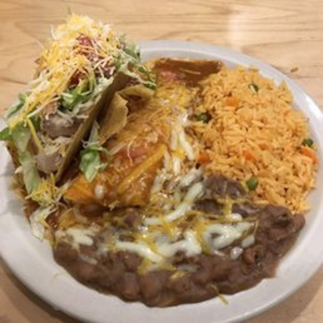 A corn tortilla filled with shredded chicken and topped with enchilada sauce and melted cheese. Served with rice and refried beans.