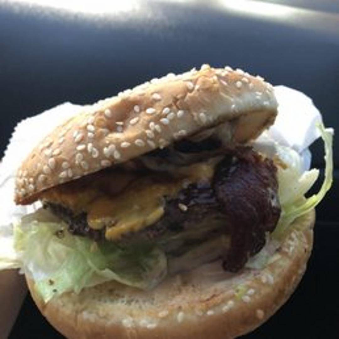 A juicy beef patty topped with crispy bacon, melted cheddar cheese, tangy BBQ sauce, and golden onion rings, all served on a toasted bun.