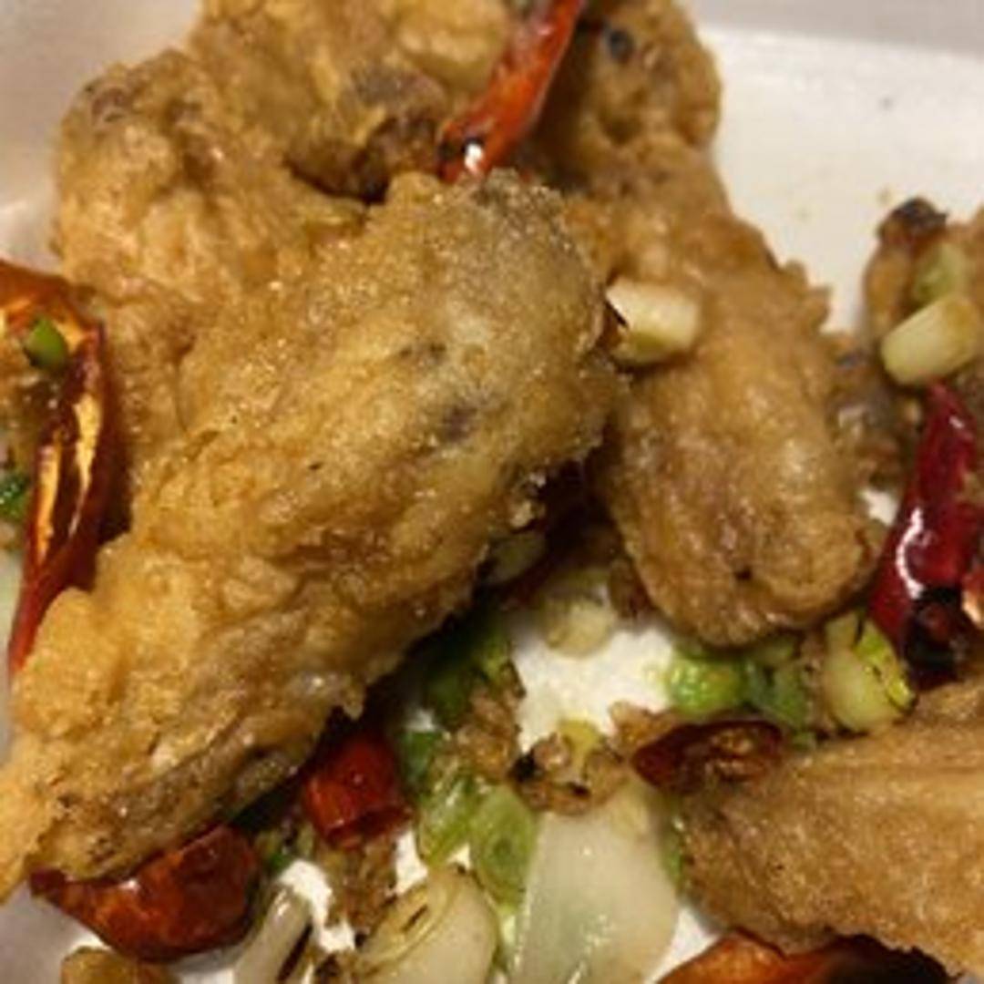 Crispy, deep-fried chicken wings seasoned with a blend of salt and freshly cracked black pepper. Often includes other aromatic spices like garlic and chili flakes for a flavorful kick. Served hot and are a popular appetizer.