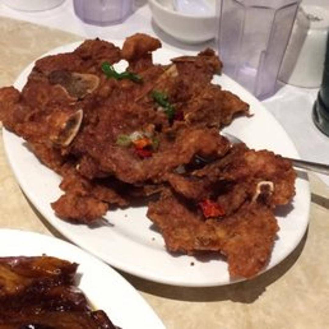 Succulent pork chops, typically bone-in, coated in a light batter and deep-fried until golden brown and crispy. Seasoned generously with salt and freshly cracked black pepper, often accompanied by other spices like garlic and chili. A flavorful and savory main course.