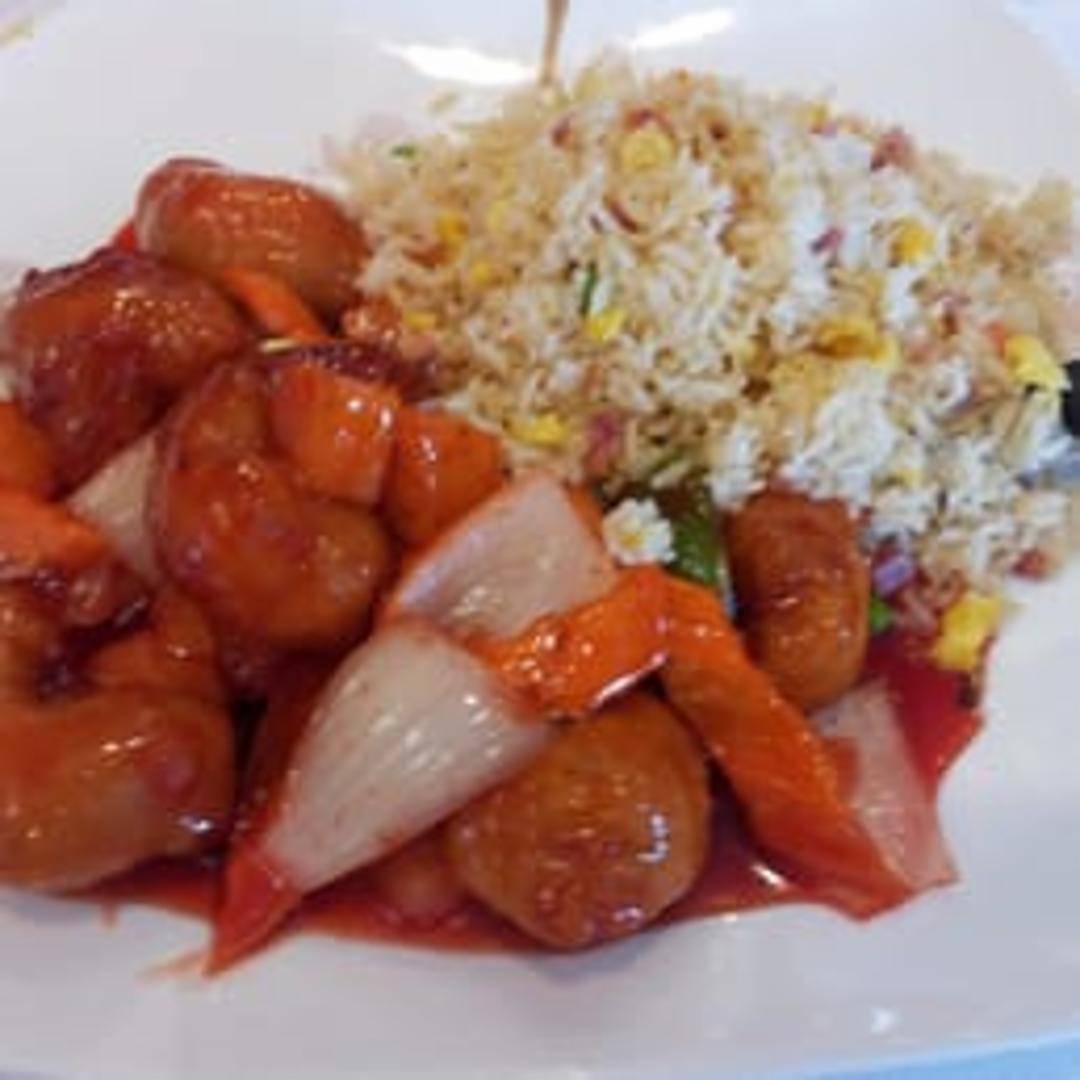 Classic fried rice dish featuring tender pieces of pork, fluffy rice, scrambled eggs, diced carrots, peas, and savory soy sauce. Wok-tossed to perfection for a flavorful and satisfying meal.