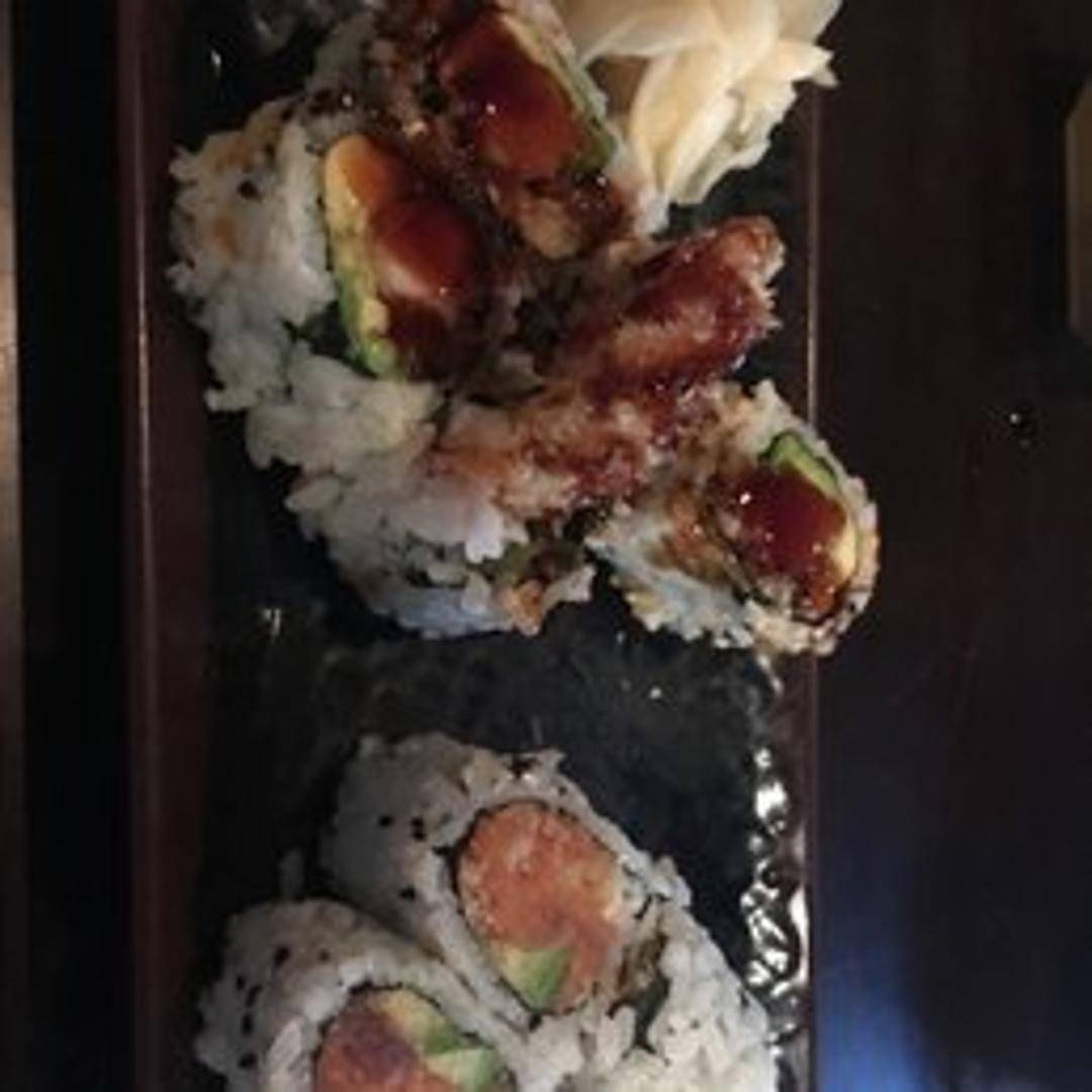 A sushi roll featuring crispy shrimp tempura, typically combined with rice, seaweed (nori), and other ingredients like avocado, cucumber, or sauces such as eel sauce or spicy mayonnaise. Cut into bite-sized pieces.