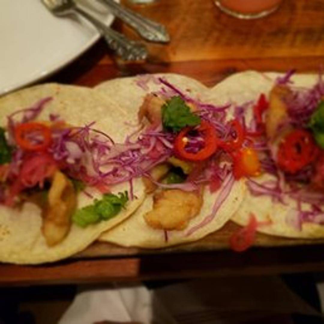 A vibrant and zesty taco featuring perfectly cooked, flaky fish (crispy or grilled) nestled in a warm tortilla. It's elevated with a crisp, refreshing slaw, a drizzle of creamy, tangy sauce, and a generous kick of house-made spicy salsa, offering a delightful balance of textures and bold flavors.