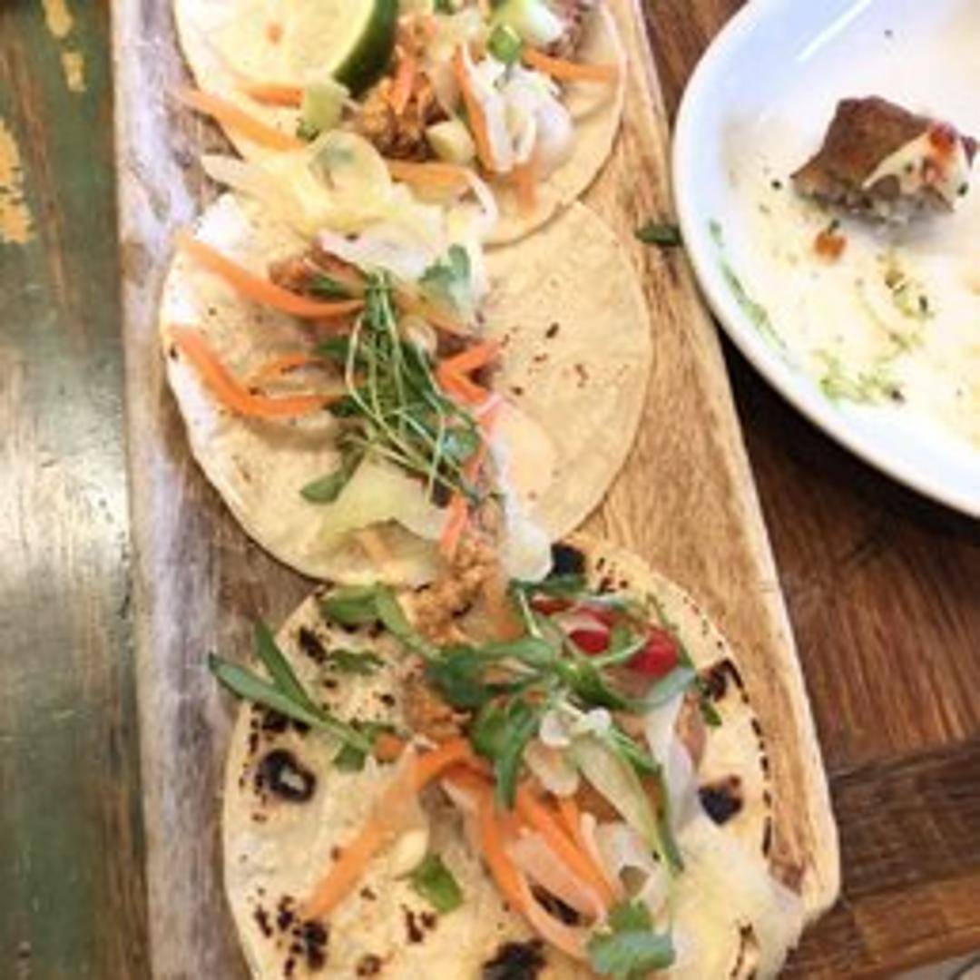 Indulge in our Fried Chicken Tacos, where crispy, seasoned pieces of tender fried chicken are delicately placed within soft corn tortillas. These flavorful tacos are elevated with a cooling avocado crema, a scattering of cotija cheese, and a fresh salsa, providing a satisfying crunch and a rich, savory experience with every bite.