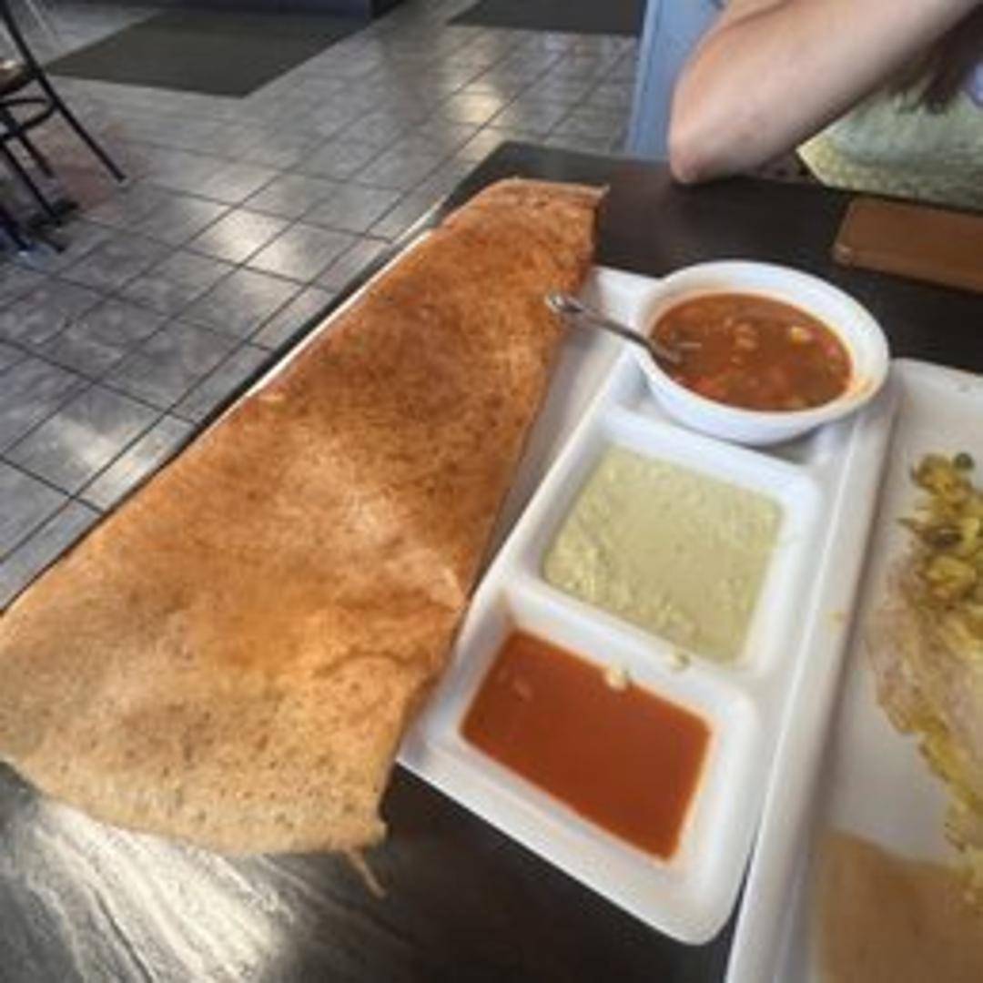 A crispy South Indian crepe filled with a spiced potato mixture. Served with sambar and chutney.