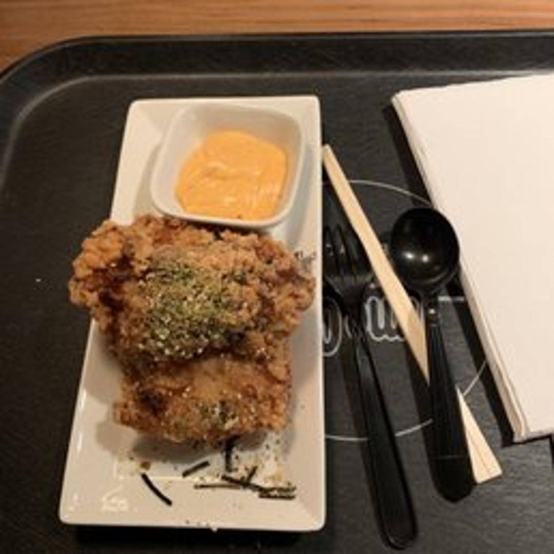 Japanese fried chicken: bite-sized pieces of chicken marinated in soy sauce, ginger, and garlic, then coated in potato starch and deep-fried until golden brown and crispy. Often served with a dipping sauce such as Japanese mayonnaise or a sweet and sour sauce. Garnished with lemon wedge.