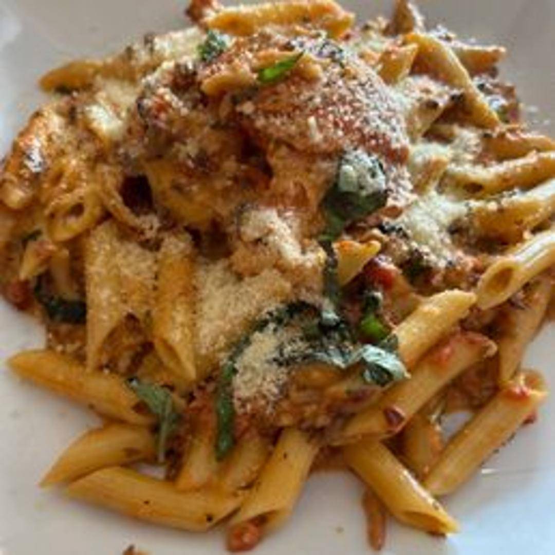 Penne pasta tossed with lobster meat in a creamy pink sauce.