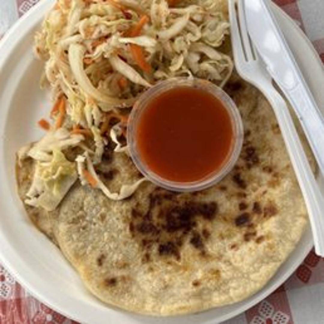 Pupusa filled with a mixture of pork, beans, and cheese. Served with curtido (cabbage slaw) and salsa roja.