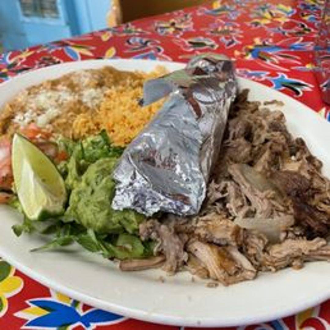 Slow-cooked, tender pork carnitas served with rice, beans, your choice of tortillas, and a side of salsa. Includes a drink.