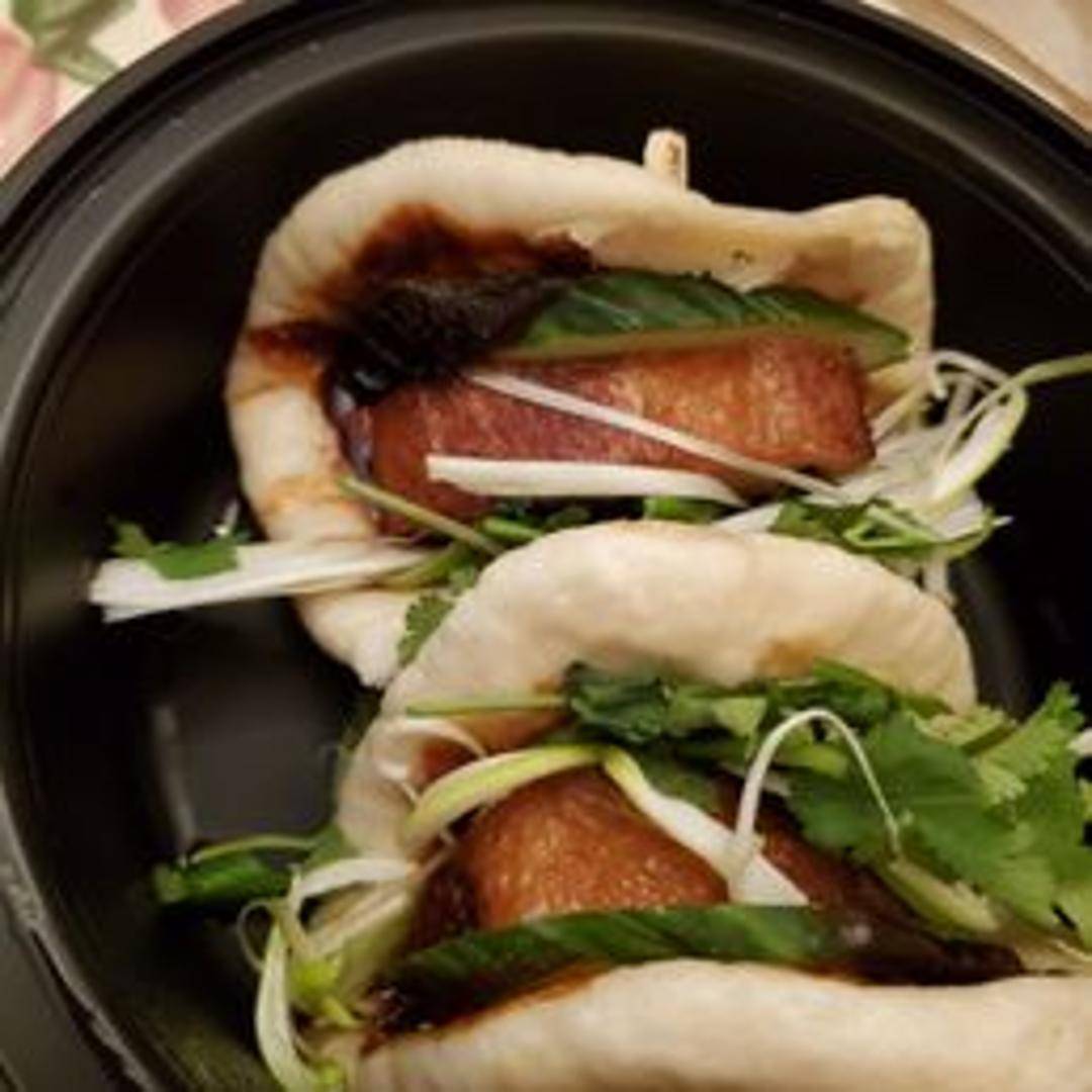 Soft, fluffy steamed bao buns generously filled with succulent, roasted or braised duck meat, complemented by a rich hoisin sauce, crisp cucumber slivers, and fresh scallions, offering a delightful blend of textures and tastes.