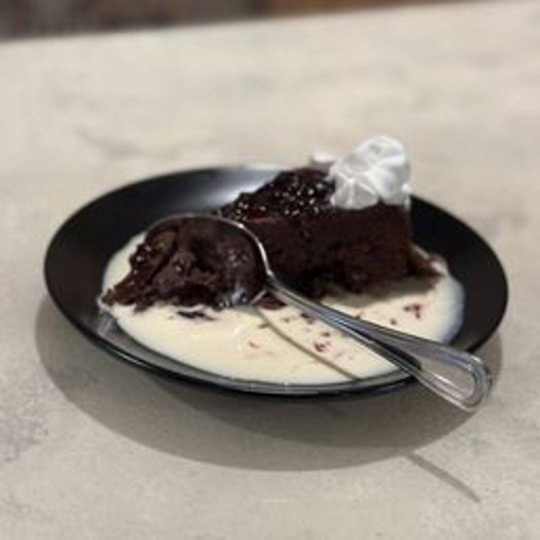 Rich, decadent chocolate torte with a smooth ganache topping, served with fresh berries and a dollop of whipped cream.