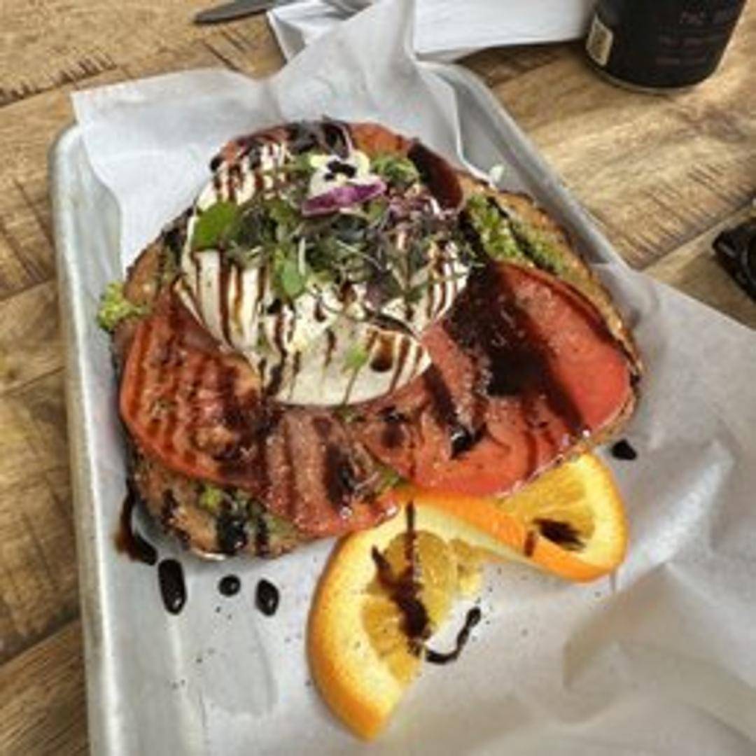 Grilled artisan bread topped with fresh mozzarella, sliced tomatoes, basil pesto, and a balsamic glaze drizzle.