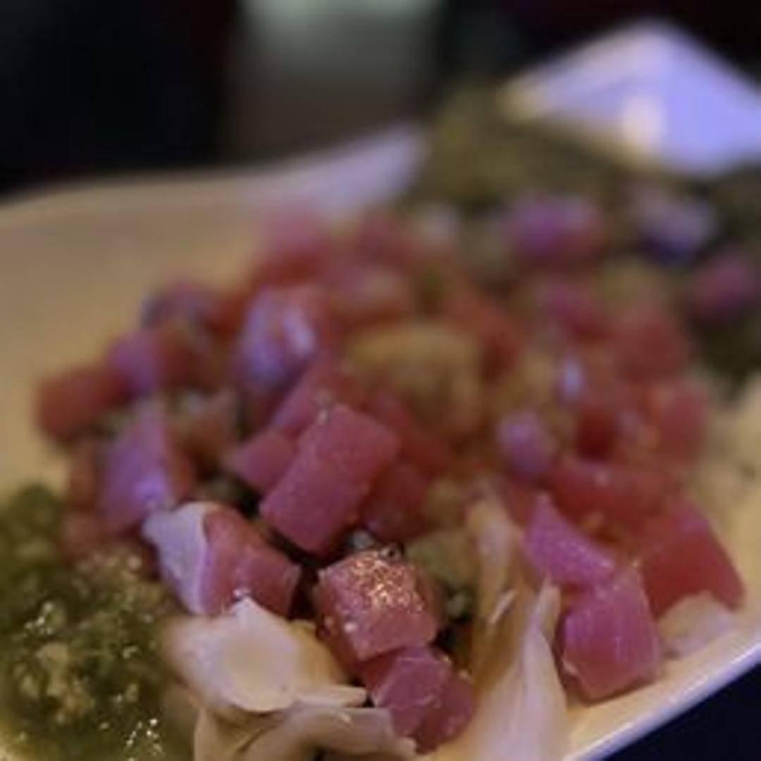 A customizable bowl featuring marinated raw fish (tuna or salmon), rice, avocado, edamame, seaweed salad, cucumber, sesame seeds, and a choice of sauce.