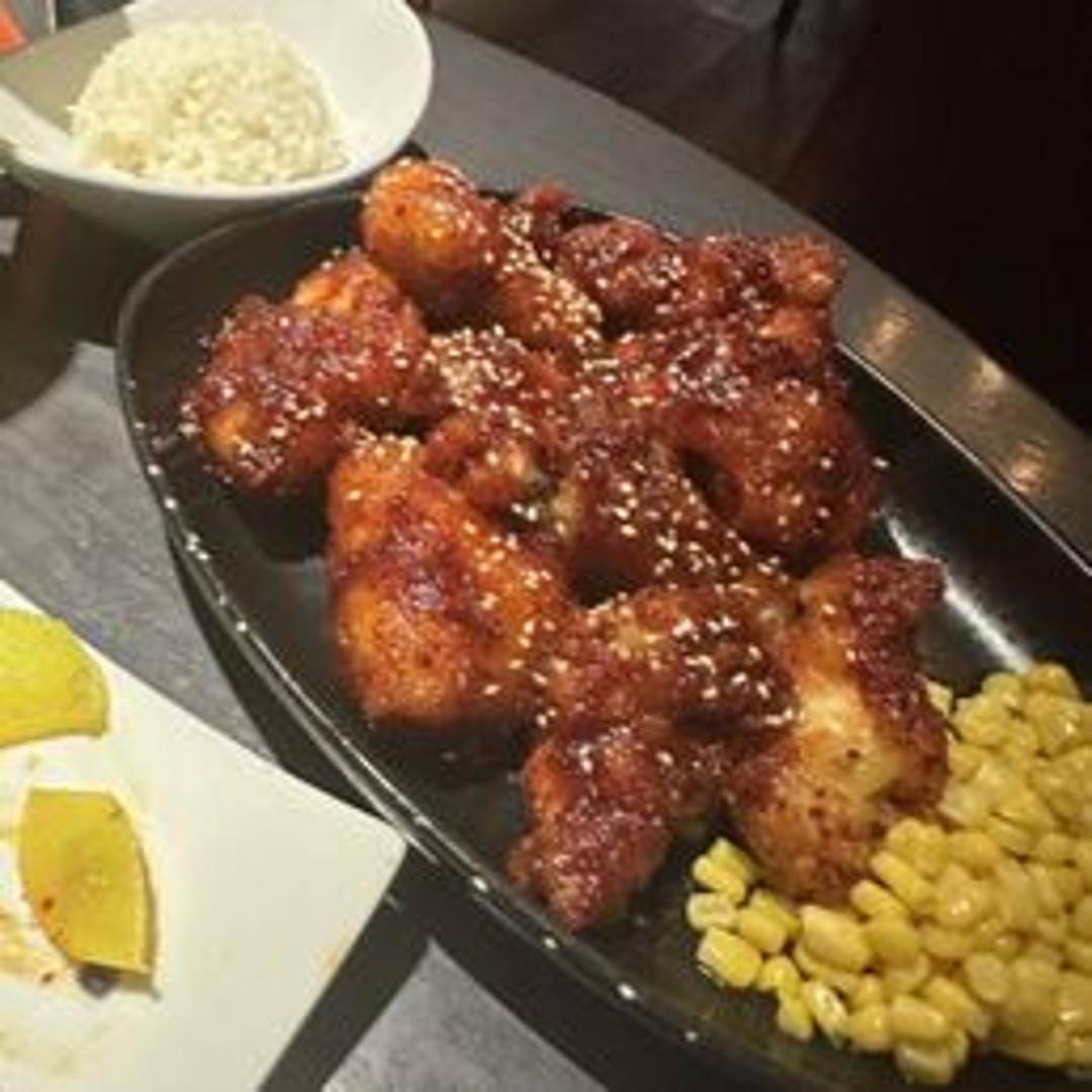 Crispy, golden-brown fried chicken tossed in a sweet and spicy General Chow's sauce, garnished with sesame seeds and served with a side of white rice.
