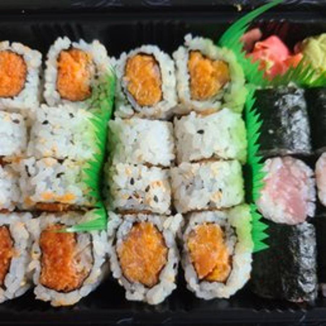 A classic sushi roll featuring fresh, high-quality salmon mixed with spicy mayonnaise, expertly rolled with seasoned sushi rice and crisp nori seaweed. May contain cucumber or avocado. Garnished with sesame seeds and a drizzle of spicy sauce. Served with ginger, wasabi, and soy sauce.