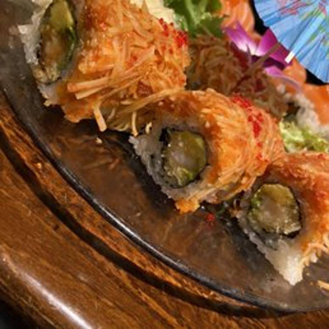 A delectable sushi roll featuring shrimp tempura and cream cheese inside, topped with crab salad and a sweet and savory eel sauce.