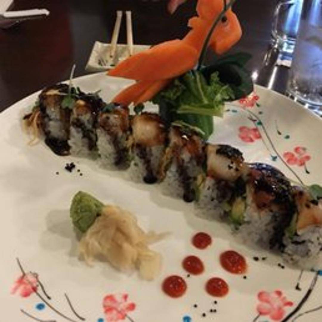 A flavorful sushi roll featuring spicy tuna, avocado, and cream cheese, deep-fried for a crispy texture. Topped with eel sauce and spicy mayo.