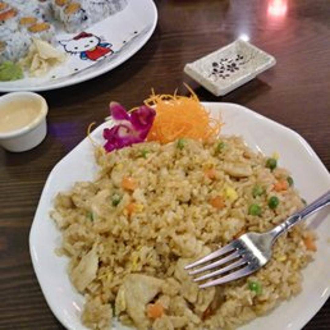 Classic fried rice dish featuring tender chicken pieces, fluffy rice, scrambled egg, peas, carrots, and green onions. Seasoned with soy sauce and other savory spices for a balanced and flavorful experience.