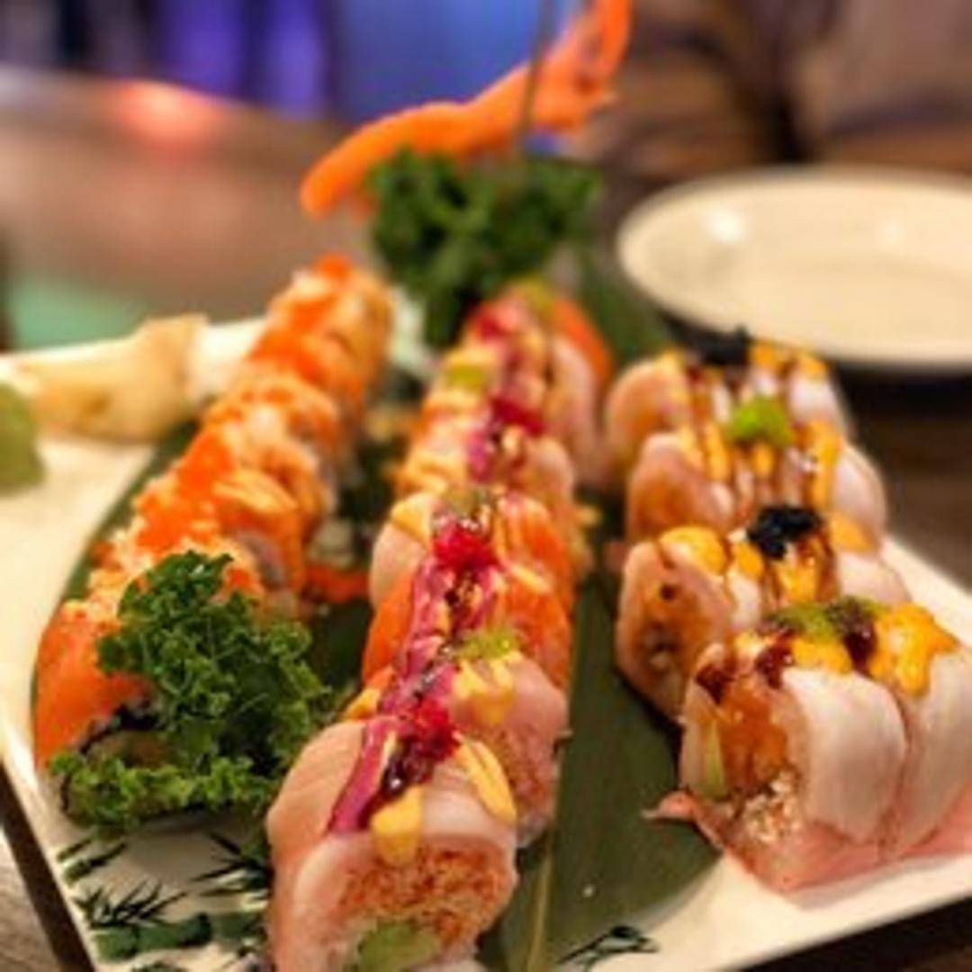 A special sushi roll featuring tuna, avocado, and cream cheese, wrapped in soy paper. Topped with spicy mayonnaise and eel sauce.