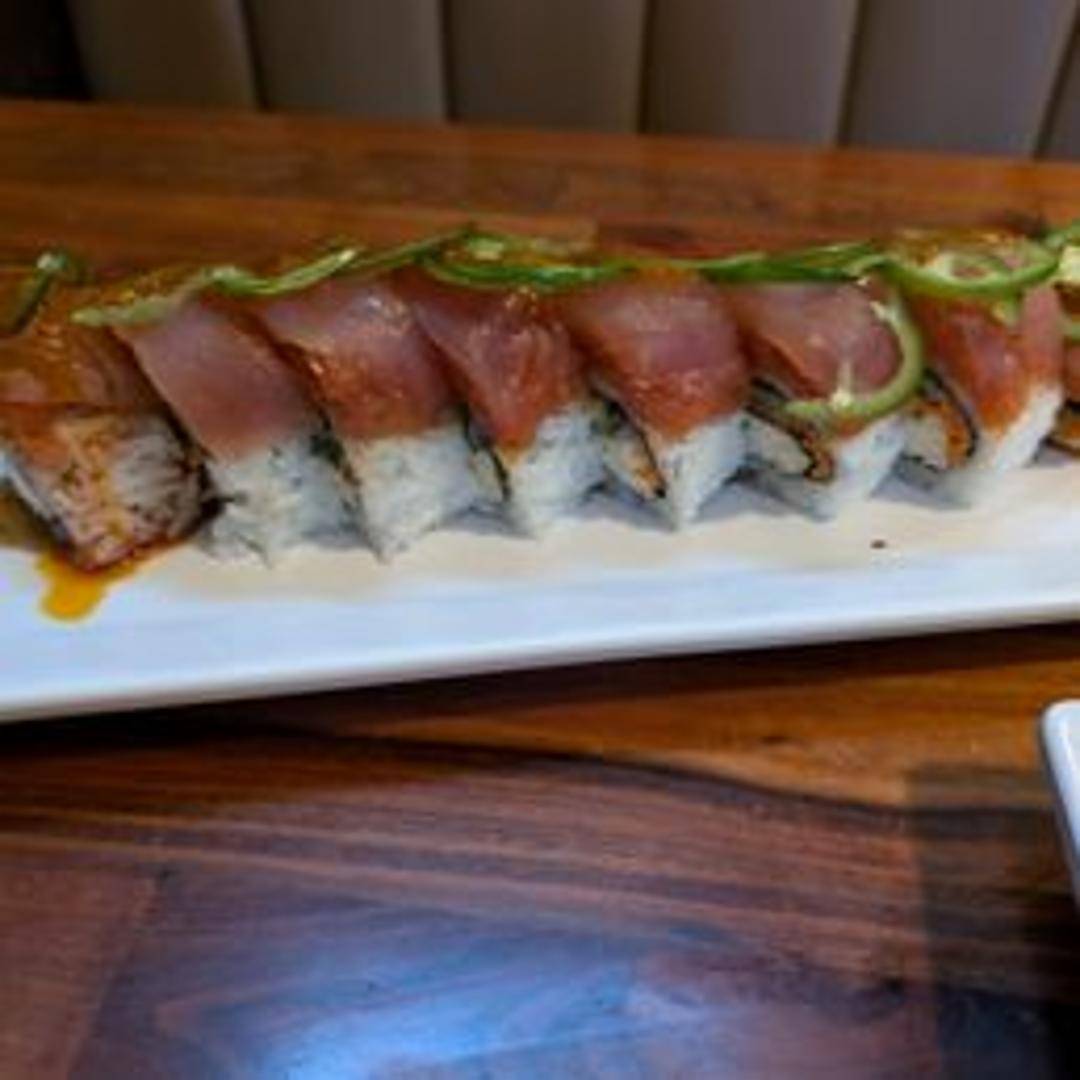 A roll with ingredients inspired by Mexican cuisine. Likely contains elements like avocado, cilantro, spicy sauce, and possibly shrimp or other seafood.
